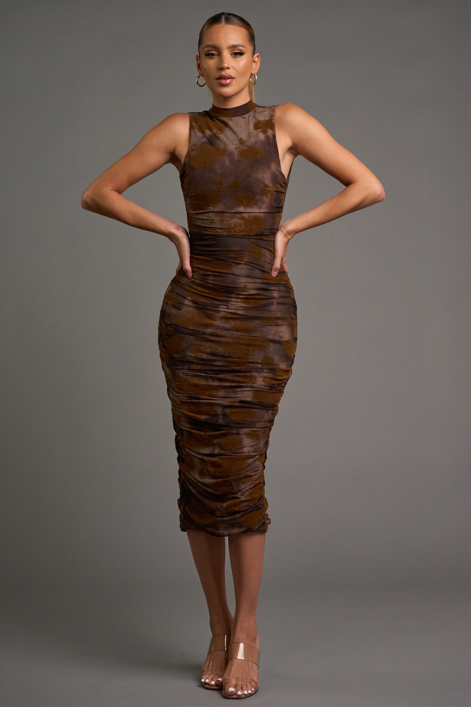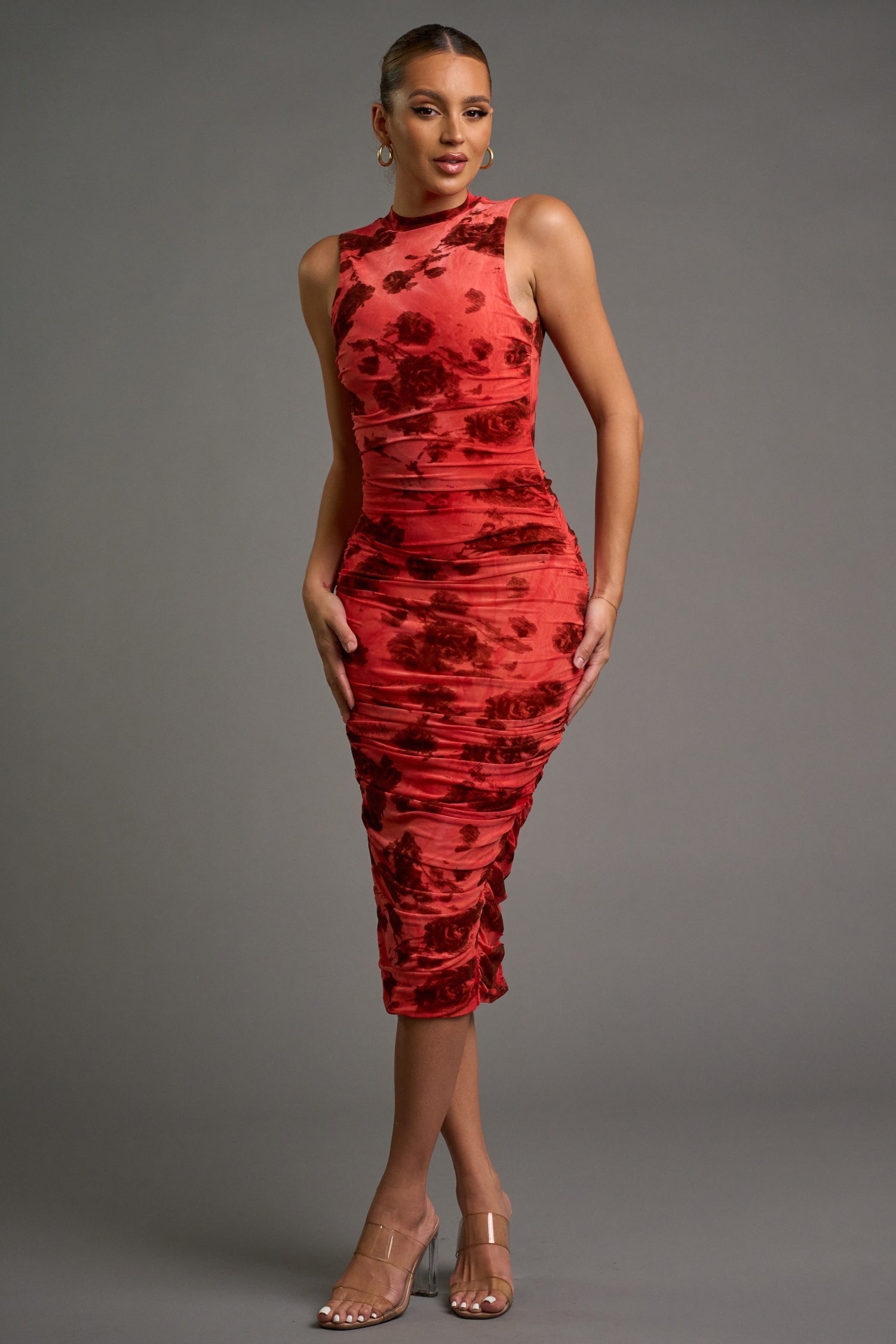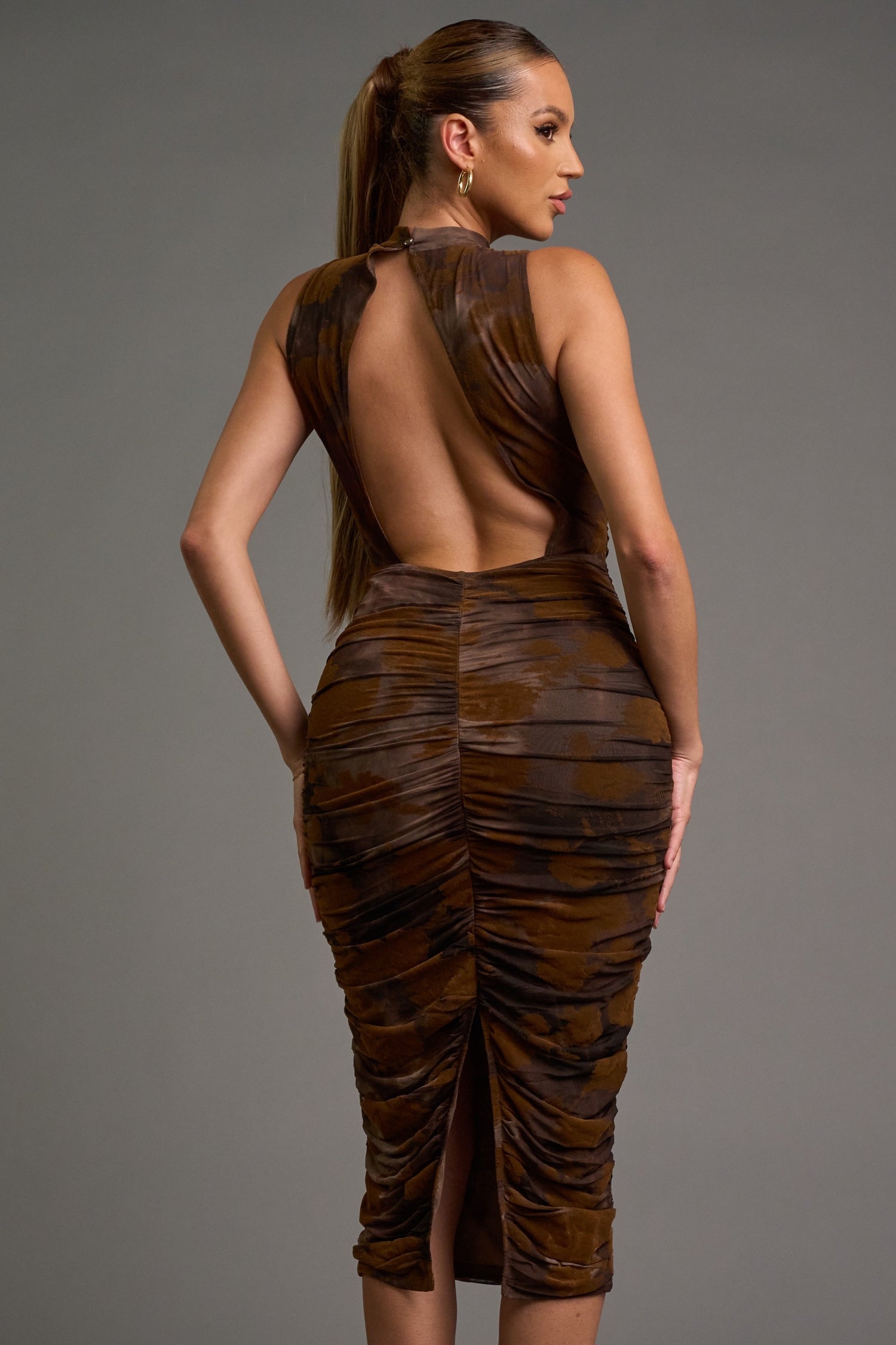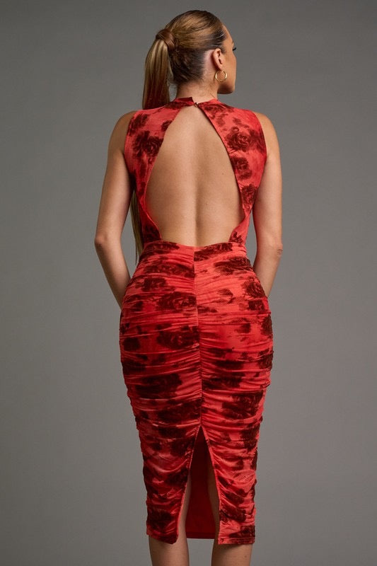 CHIC FLORAL VELVET FLOCKING MESH HALTER MIDI DRESS. The luxurious velvet flocking and delicate floral design make this dress a showstopper. The open back and bodycon fit enhance your curves, while the back slit adds a touch of allure. Made with 100% polyester, this imported dress will be a go-to for any event. Model is 5'8" and wearing a small.