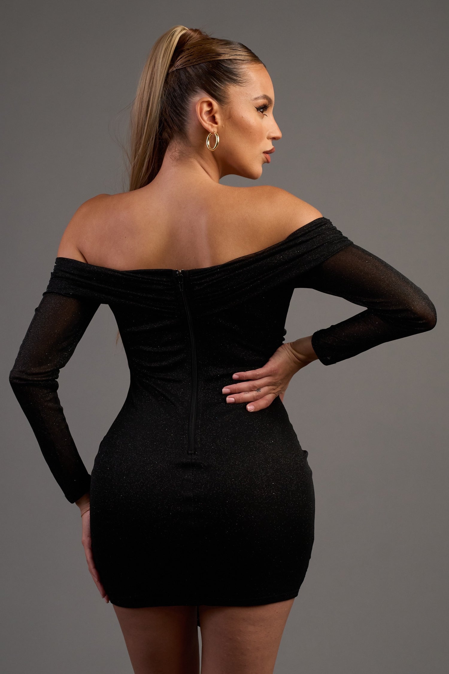 GLITTER MESH OFF SHOULDER RUCHED MINI DRESS