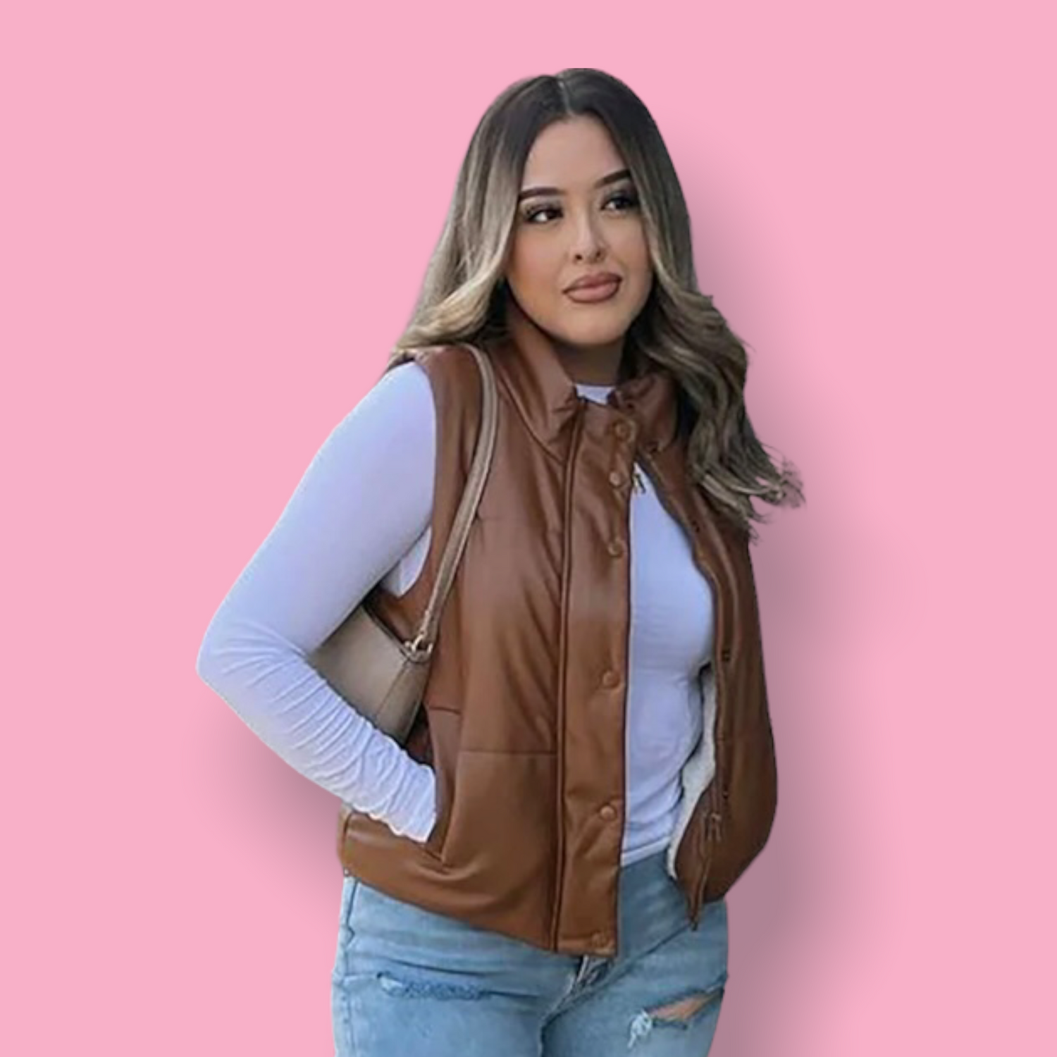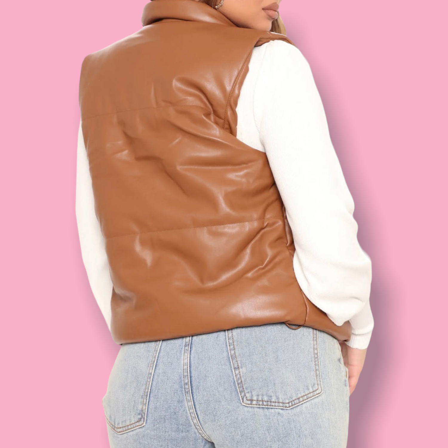 Women puff faux leather vest featuring a quilted dual snap-button and zip-up front, slanted front pockets, with a Matte finished look and faux fur inside.